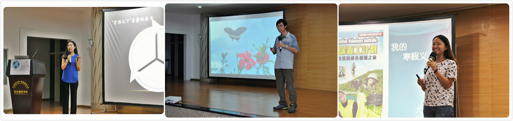 来自香港浸会大学传理学院的马彦妮女士从传媒学的角度分享她对《穹顶之下》的解读与思考。鸟兽虫木的彭宇先生通过生动的图片介绍了“自然讲解员”这一职业,分享他作为“自然讲解员”的个人经历。来自大一国新的杨晶晶同学分享了她在假期期间参与的澳大利亚环保义工项目。