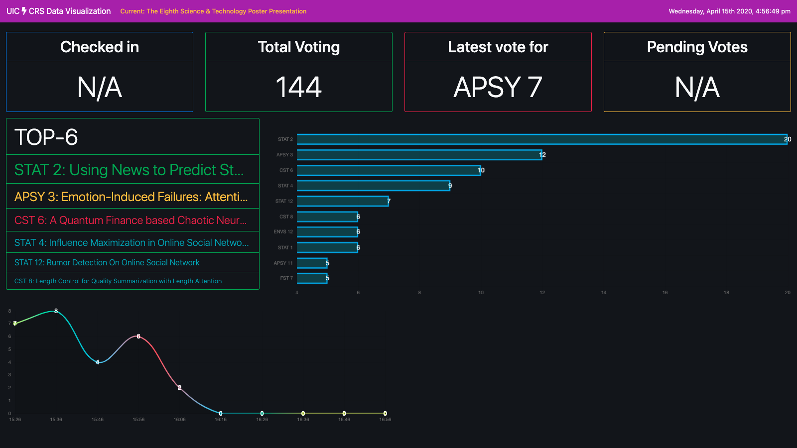值得一提的是,评委和师生们用于线上投票及实时计票的活动管理系统Conference Registration System(CRS)为2016级计算机科学与技术专业伍正豪、邓仁杰和2017级数据科学专业梁昌源自主研发,该系统可简化活动的管理流程,提高效率。系统在2019年的第七届海报展已投入使用,今年三位同学基于原有的系统做了升级,开发了无密码注册系统、自动评分系统等。当天,共有291人注册观展,144人为心仪的海报投票。