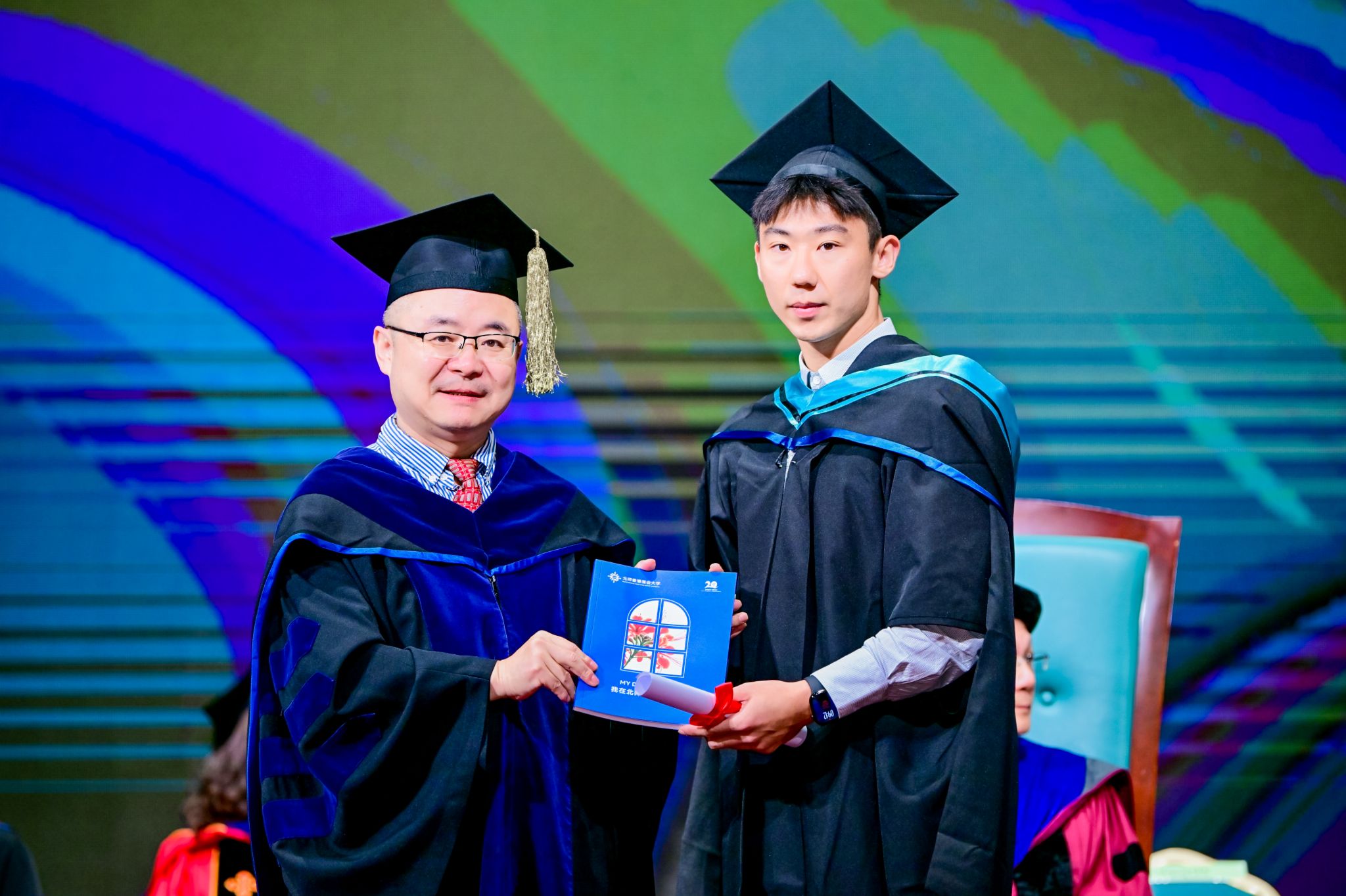 BNBU Provost Prof Patrick Chau presents a graduation certificate to a graduate