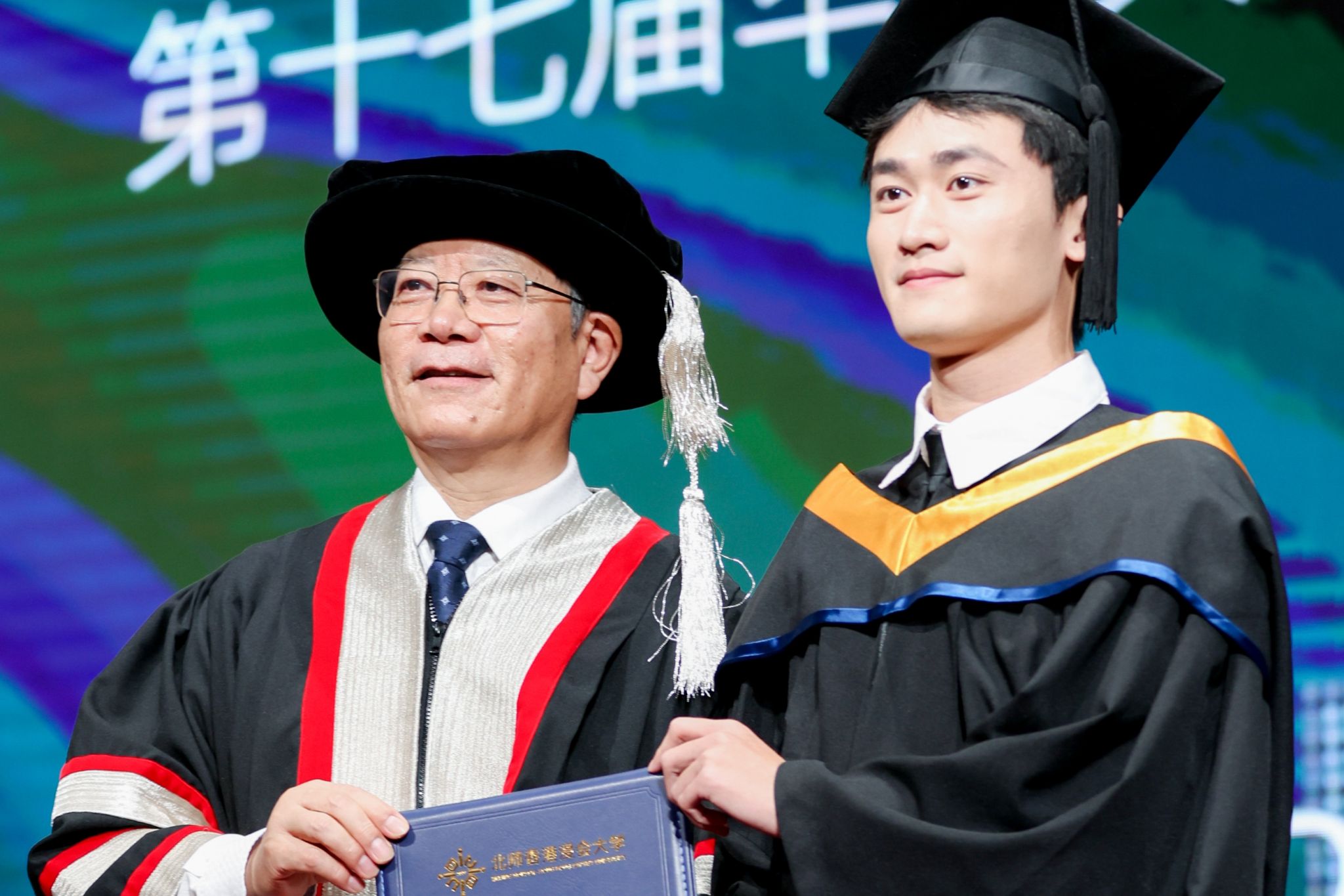 BNBU President Prof Chen Zhi presents a graduation certificate to a graduate