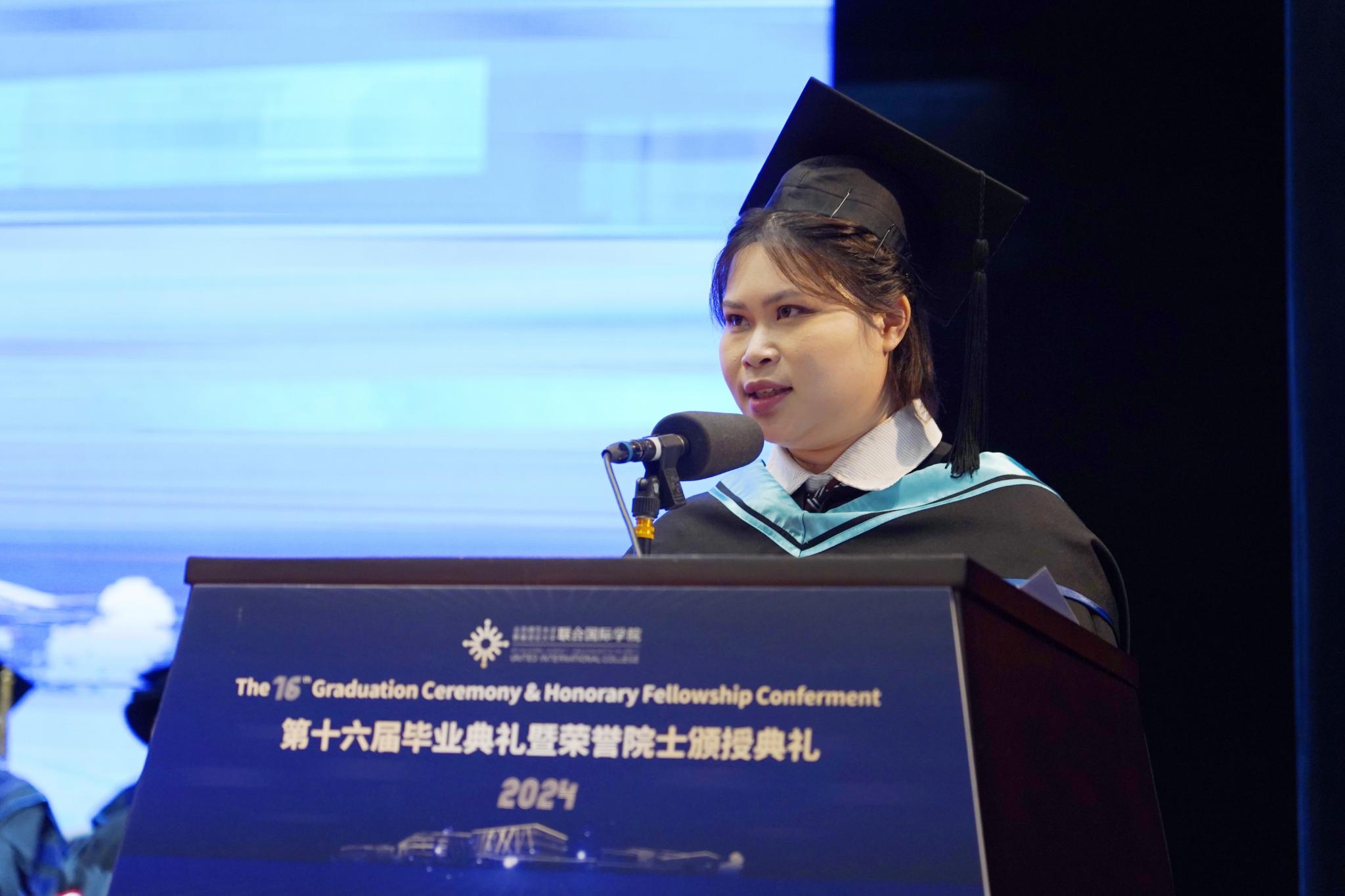 Good afternoon, a warm welcome to all our proud guests, esteemed faculty, dedicated staff, wonderful peers, beloved family, cherished friends, and most importantly the Class of 2024! Today, it is truly an honour for me, Lai Huiqian, to be here and represent the graduates from the Master Programme of Artificial Intelligence and Digital Media Concentration.