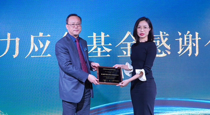 北师港浸大副校长(行政)、基金会理事长毛亚庆教授为捐赠人代表曾大雁女士颁发了感谢证书。曾大雁女士表示,他们见证了UIC一步一个脚印地茁壮成长,今后也会与UIC共同承担起应有的社会责任,传递温暖与爱。同样是“聚力应急基金”捐赠人、吉林福源馆食品集团有限责任公司董事长宋亚坤女士表示:“UIC孜孜不倦、踏踏实实地在为自己创造光明的发展前景,希望大家都能为UIC更好的明天加油、助力。”