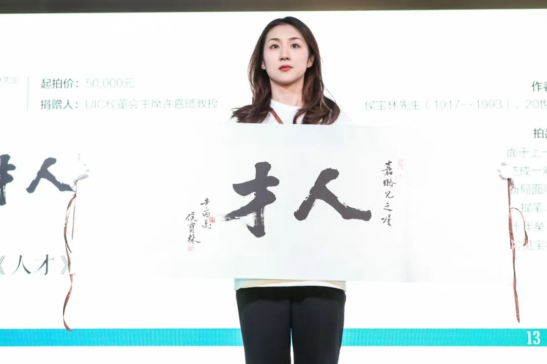 当晚,不少拍品都承载着对UIC成长的见证和祝福。UIC校董会主席、前全国人大常委会副委员长许嘉璐教授特意将著名相声表演艺术家侯宝林先生赠送的墨宝《人才》捐出,寄托了他对UIC继续培养人才的殷切期望和一片深情。此拍品最终由珠江教育医疗集团执行董事、UIC教育基金会创会理事长续红女士以31万元拍得。