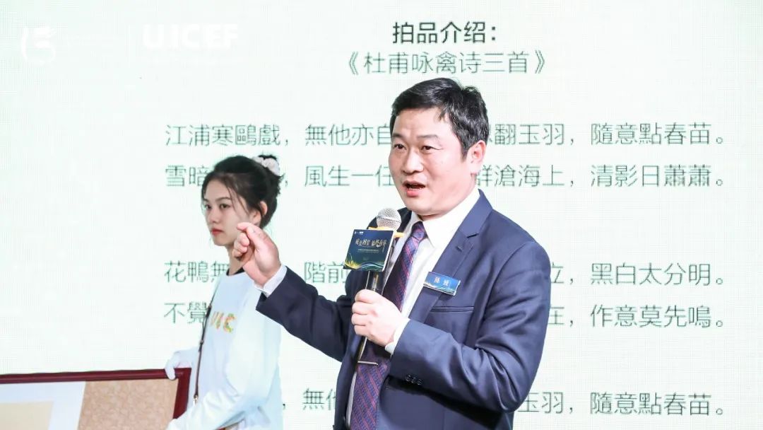 合图教育科技股份有限公司董事长刘峰先生以16万元拍得汤涛校长捐赠的拍品院士定制酒《干杯》,珠海菁莪品牌管理有限公司总经理曾大雁女士以10.2万元拍得常务副校长陈致教授捐赠的书法藏品《杜甫咏禽诗三首》。当晚所有参与捐赠、拍卖和收藏拍品的社会各界朋友,都体现了对UIC的厚爱,诚挚地感谢大家的支持。