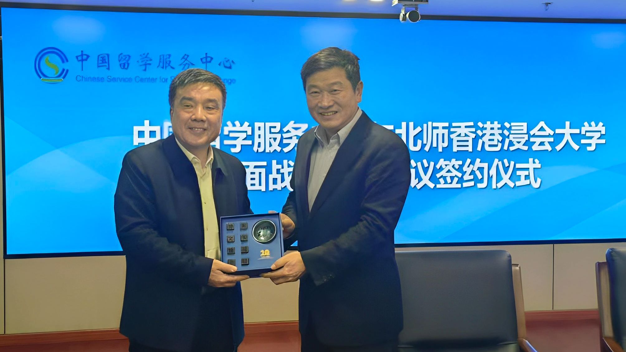 Wang Daquan, Secretary of the Party Committee and Director-General of the Chinese Service Center for Scholarly Exchange (CSCSE) of the Ministry of Education (right) with BNBU President Prof Chen Zhi