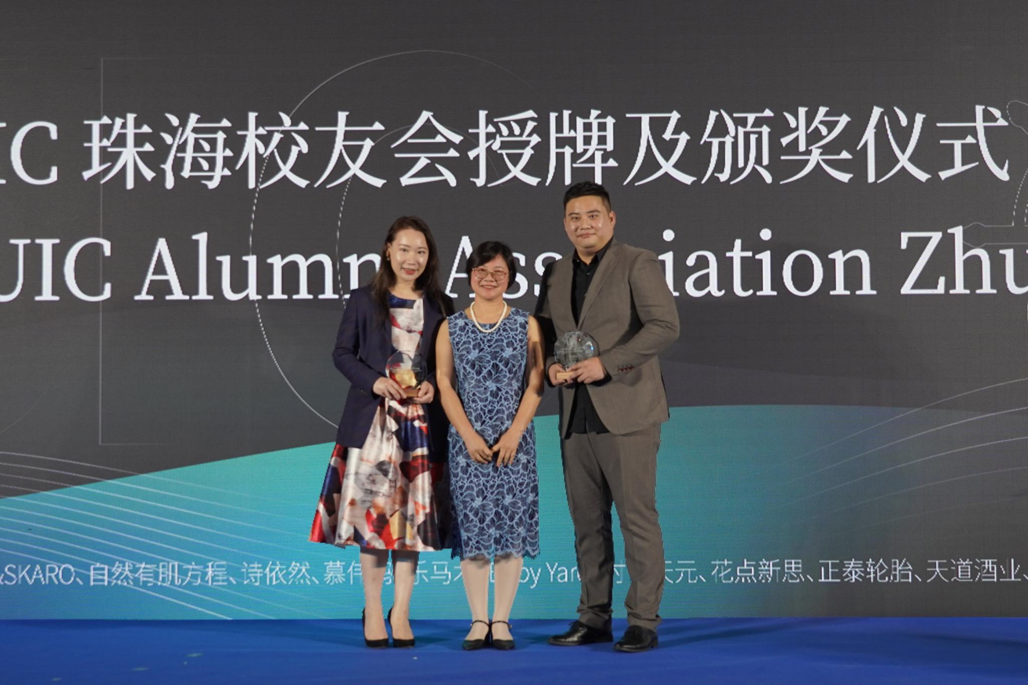 Ms Lin Meiyu (middle) presents awards to the first President Mr Zou Ninghua (right) and first Vice President Ms Deng Jiahui (left) of the UIC Zhuhai Alumni Association