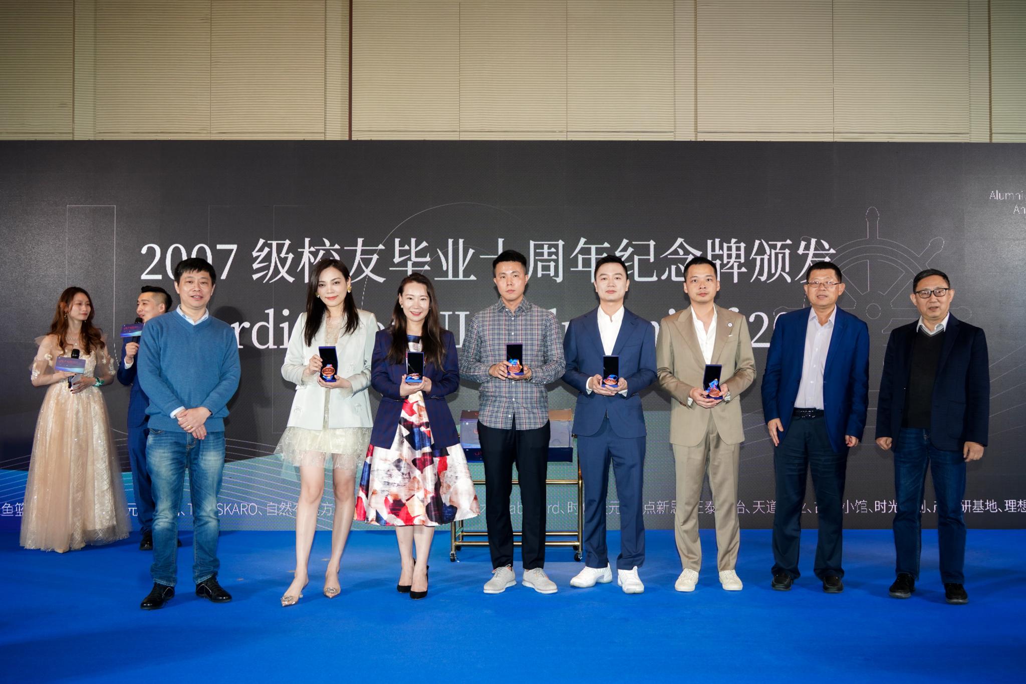 Dean of Division of Business and Management Prof Liu Wenbin (second from right in the front row), Executive Dean of Division of Culture and Creativity Dr Jiang Wei (first from left in the front row), and Associate Dean of Division of Science and Technology Prof Lei Bo (first from right in the front row) present the 10th-anniversary award to the alumni who graduated in 2011