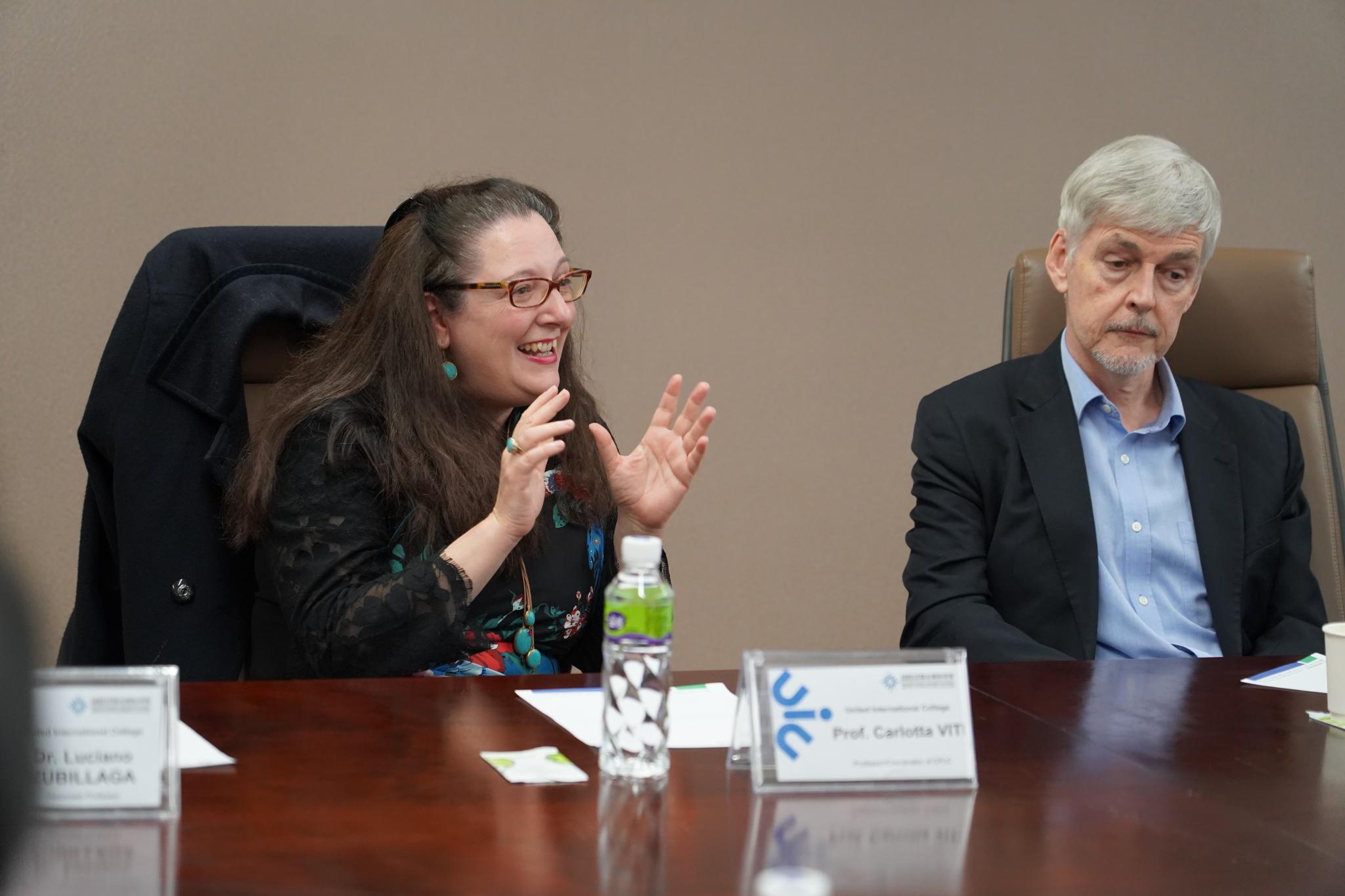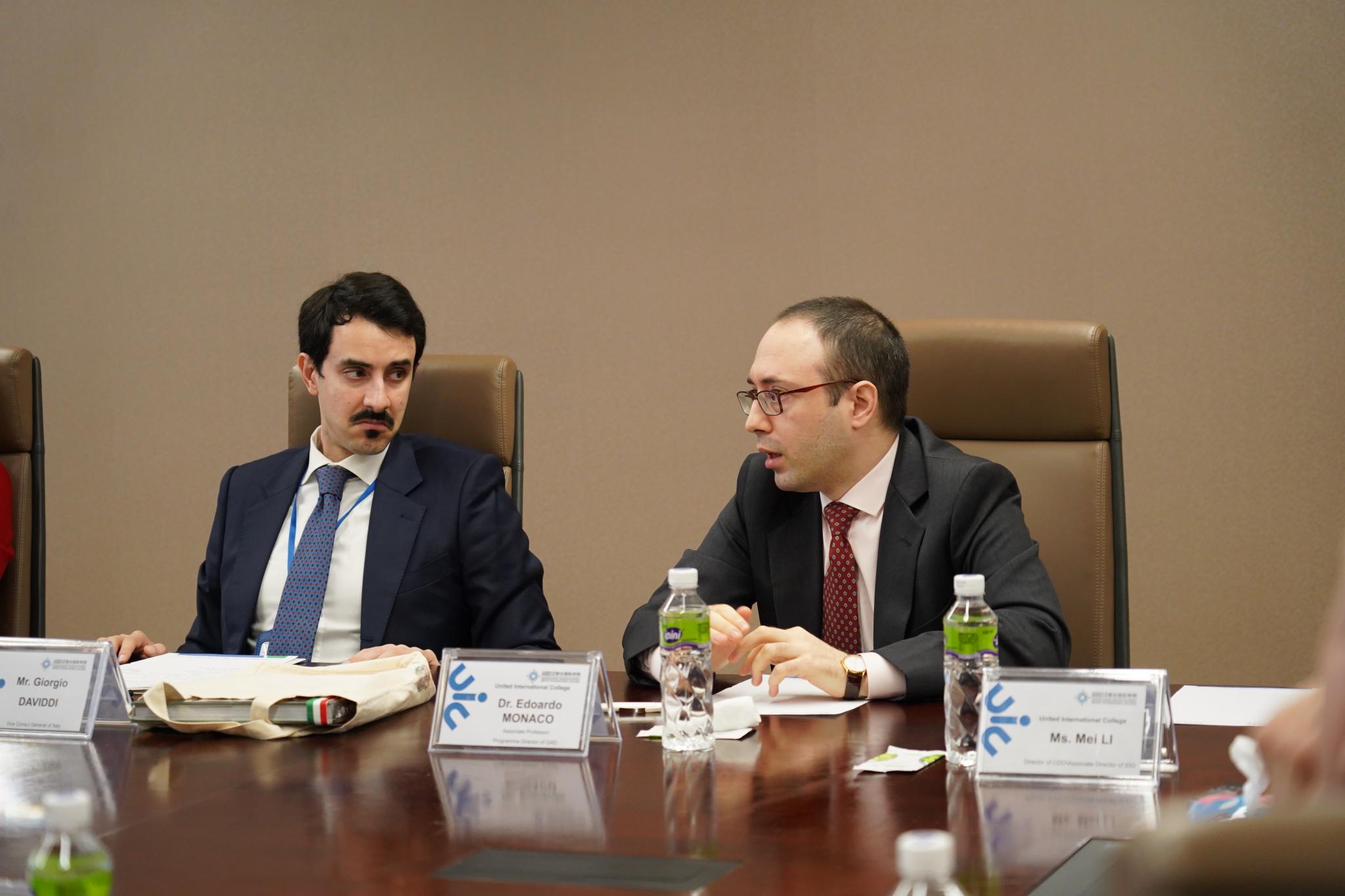 Mrs Pasqualini indicated that donations of Italian books cultural exchange activities within the province would be a promising start. After a very productive exchange of ideas, Mrs Lucia Pasqualini and Mr Giorgio Daviddi continued with a meeting with Italian faculty members at UIC, including Prof Carlotta Viti, Professor and Coordinator of CFLC; Dr Edoardo Monaco, Associate Professor and Programme Director of Globalisation and Development; Assistant Professor of Divison of Science and Technology, Dr Hu Yujia; and Associate Professors of Division of Culture and Creativity Dr Vincenzo De Masi and Dr Luciano Zubillaga.