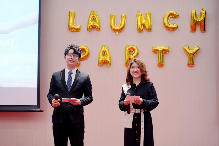 Ye Liting (left) and Bao Xingyu (right) welcoming everyone to the launch party