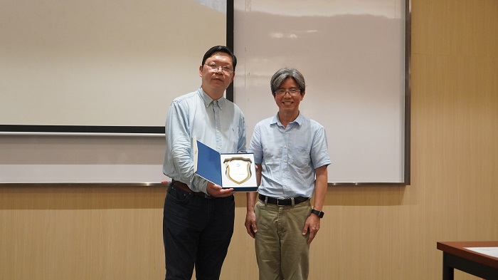 UIC Vice President (Academic) Prof Huang Huaxiong (right) presents a souvenir to Prof Liao Shijun