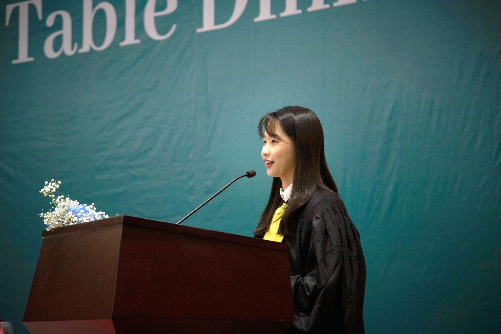Student representative Cai Yidi from Student Hostel Council gave a speech during the high table dinner, addressing the significance of the Student Hostel Council as a bridge between the college and students.