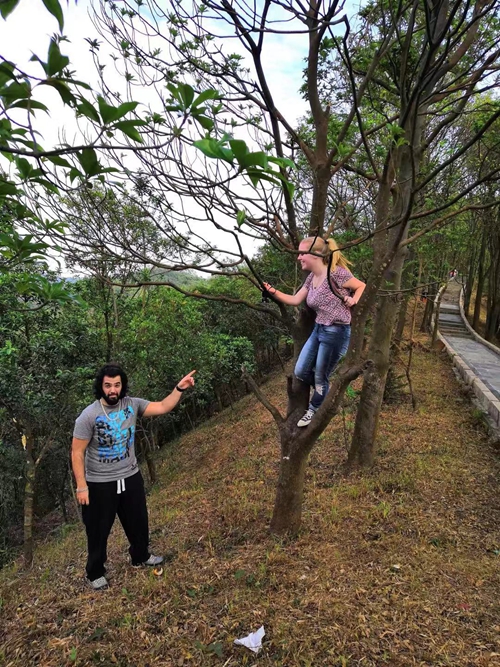 An energetic Patricia climbs a tree. Mohamad is impressed