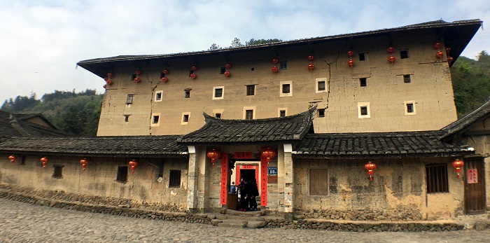 The group then got on a small bus to head to the Fujian Tulou Landmark Building. This World Cultural Heritage site consists of a square Buyun Building and the circular Zhenchang Tower, Ruiyun Building, Hechang Building and Wenchang Building. It is known as the “four dishes and one soup” or “the UFO that fell out of sky”.