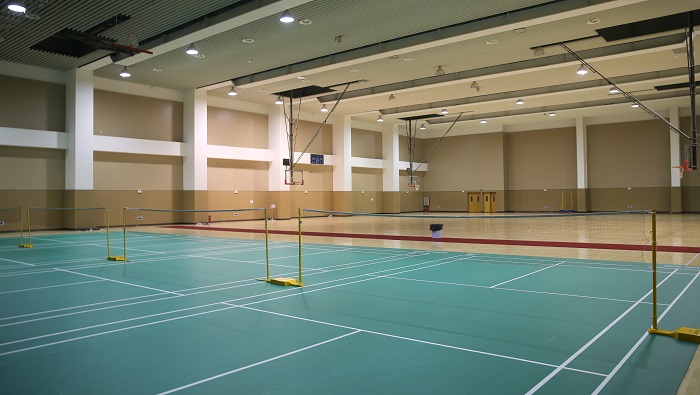 This new Sports Complex has five floors and a rooftop, which are all used as classrooms for fitness and sports training. There is a weight training zone with a 360 multi-function training station in place, a warm up stretching room, several training rooms as well as a fitness and health room. On the first floor is a heated indoor swimming pool, a fencing room and a boxing room. The second floor offers a table tennis room as well as housing the entire gymnasium's offices and a medical room. A multi-purpose court for badminton and basketball, a dancing room and the referees' lounge are provided on the third floor. The fourth floor has a judo and kendo dojo in addition to a multi-media classroom while the roof of the Sports Complex holds the tennis courts.