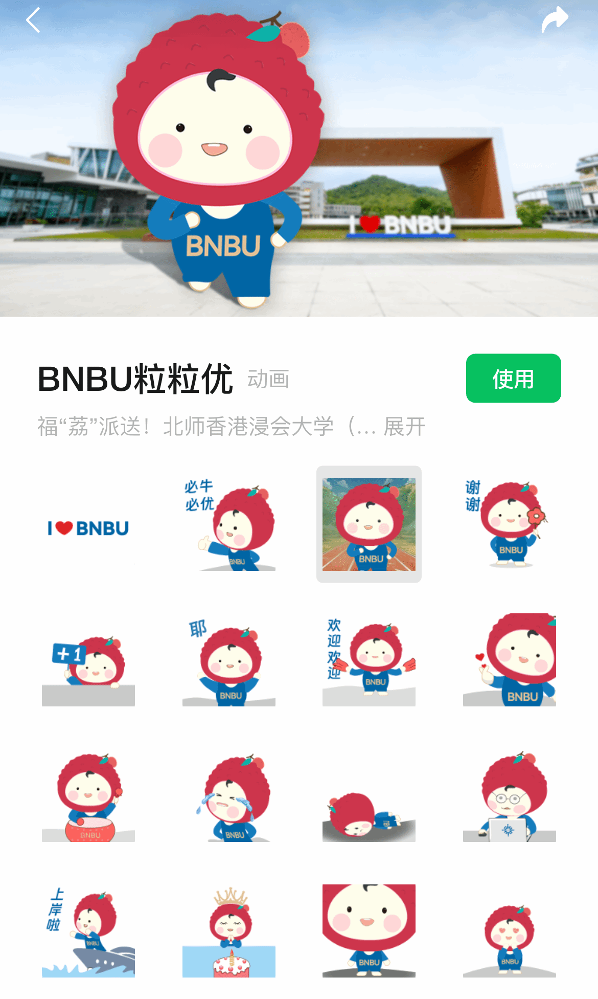 “BNBU粒粒优”表情包以校园里生动逼真的荔枝雕像为原型,可爱的粒粒优将陪伴同学们的学习生活,与BNBUer一同成长,共赴博雅之旅。