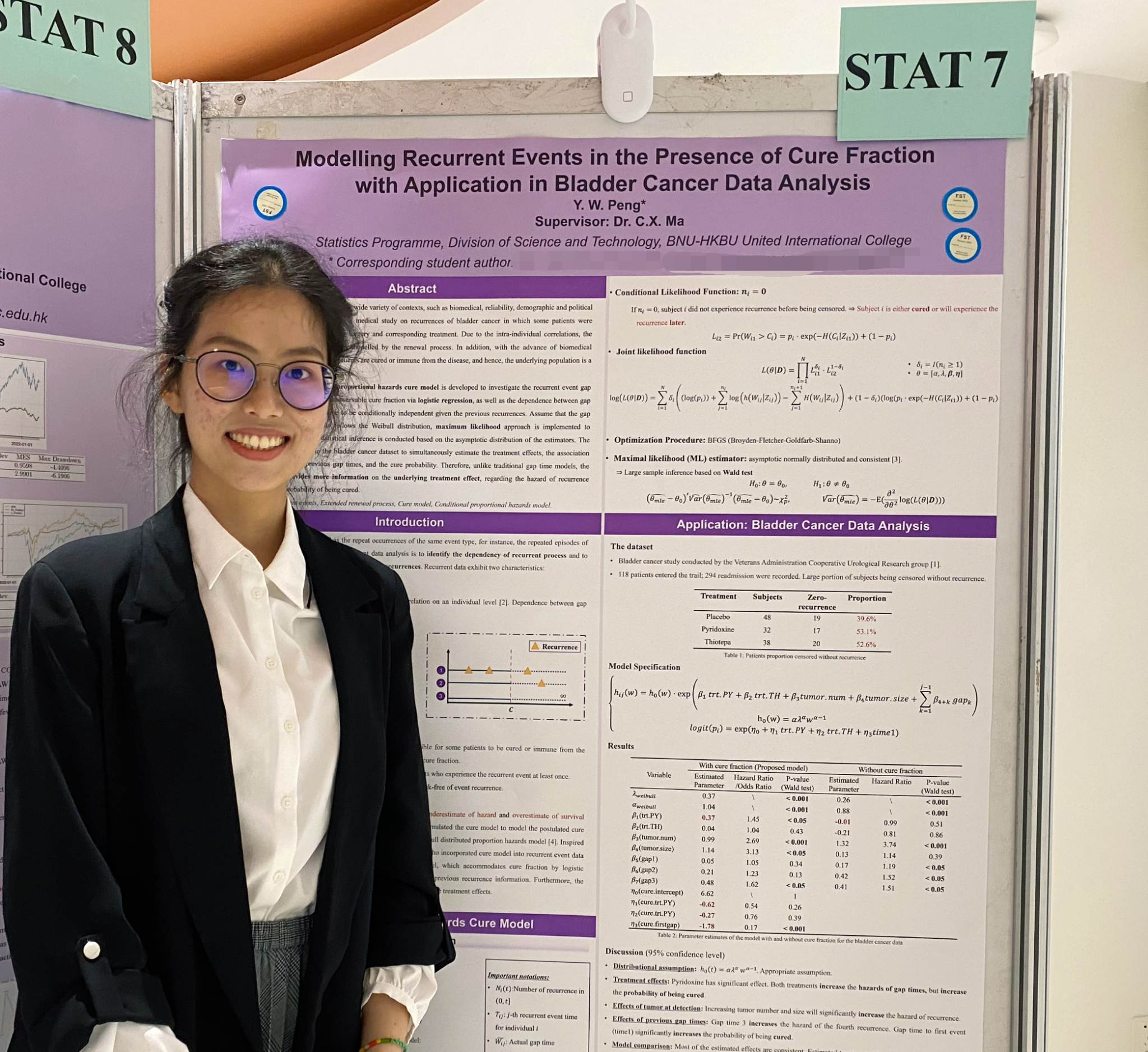 大四期间,彭雅薇在统计学专业副教授马绰欣的指导下开始了第二段科研经历,也是其毕业研究项目(FYP),研究方向是存在治愈率的复发事件建模及其在膀胱癌数据分析中的应用。正是这段和生物统计学非常契合的科研经历,很大程度上帮助彭雅薇通过了剑桥大学的面试。在与面试官交流学术内容时,大量的学术积累给彭雅薇增添了几分自信与从容。