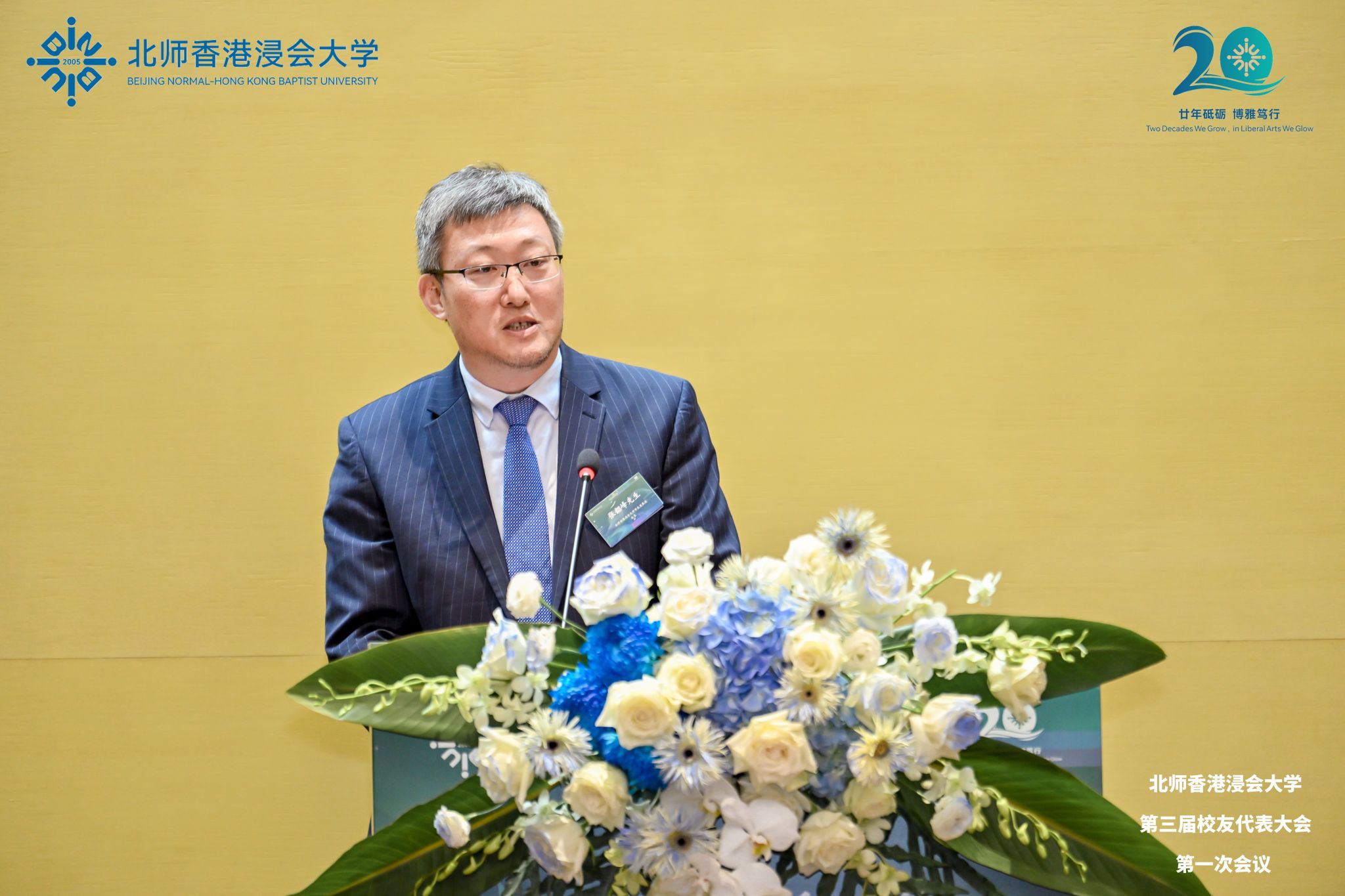 第二届校友会会长张韶峰先生则简要总结了校友会过去四年的工作进展。他提到,近年来校友会规模持续扩大,并指出,校友会始终是联结学校与全球校友的重要纽带,也是北师港浸大博雅教育精神的延续,他期待校友们同心协力,共同为母校的长远发展贡献力量。