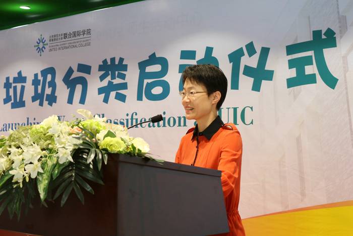在启动仪式上,珠海高新区建设环保局副局长沈洋在致辞中表示,UIC是高新区首个为响应垃圾分类号召而举办启动仪式的大学。她对校园内垃圾分类推进工作提出了四点倡议:将垃圾分类工作作为重点,落实责任;利用社团、竞赛等活动广泛宣传,营造氛围;借鉴、创新,发展出适合UIC的模式;发挥学生志愿者的作用,使垃圾分类任务长久且准确地执行。