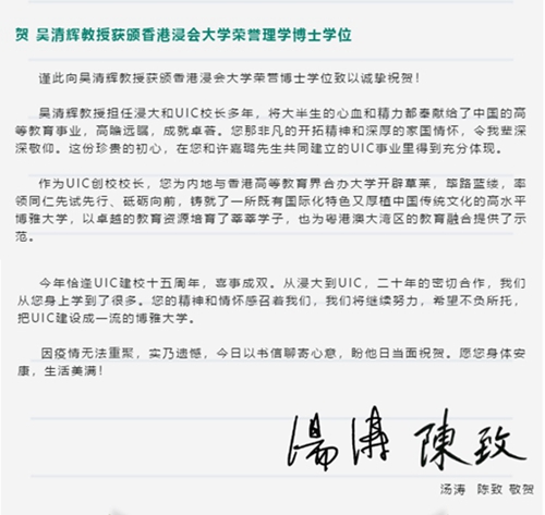 UIC校长汤涛教授、常务副校长陈致教授向吴清辉教授致以诚挚祝贺