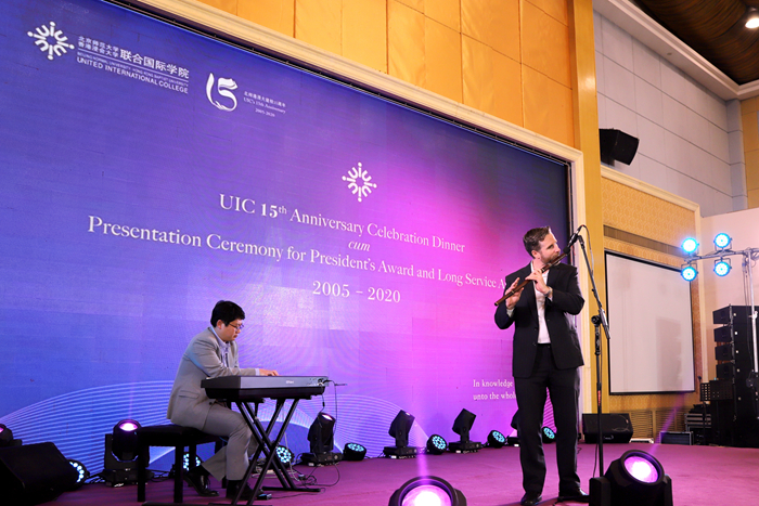 在理工科技学部助理教授Thomas J. Huggins博士与智天皓博士的节目——爱尔兰笛和电钢琴合奏《The Lonesome Boatman》的悠扬乐音中,晚会进入尾声。