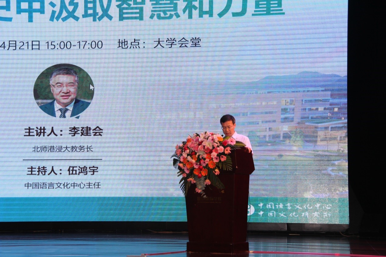 4月21日下午,北师港浸大教务长李建会教授在大学会堂为在校师生带来了一场主题为“从百年党史中汲取智慧和力量”的演讲。 该次讲座由中国语言文化中心主任伍鸿宇教授主持,亦是“形势与政策”大讲堂系列讲座之一。