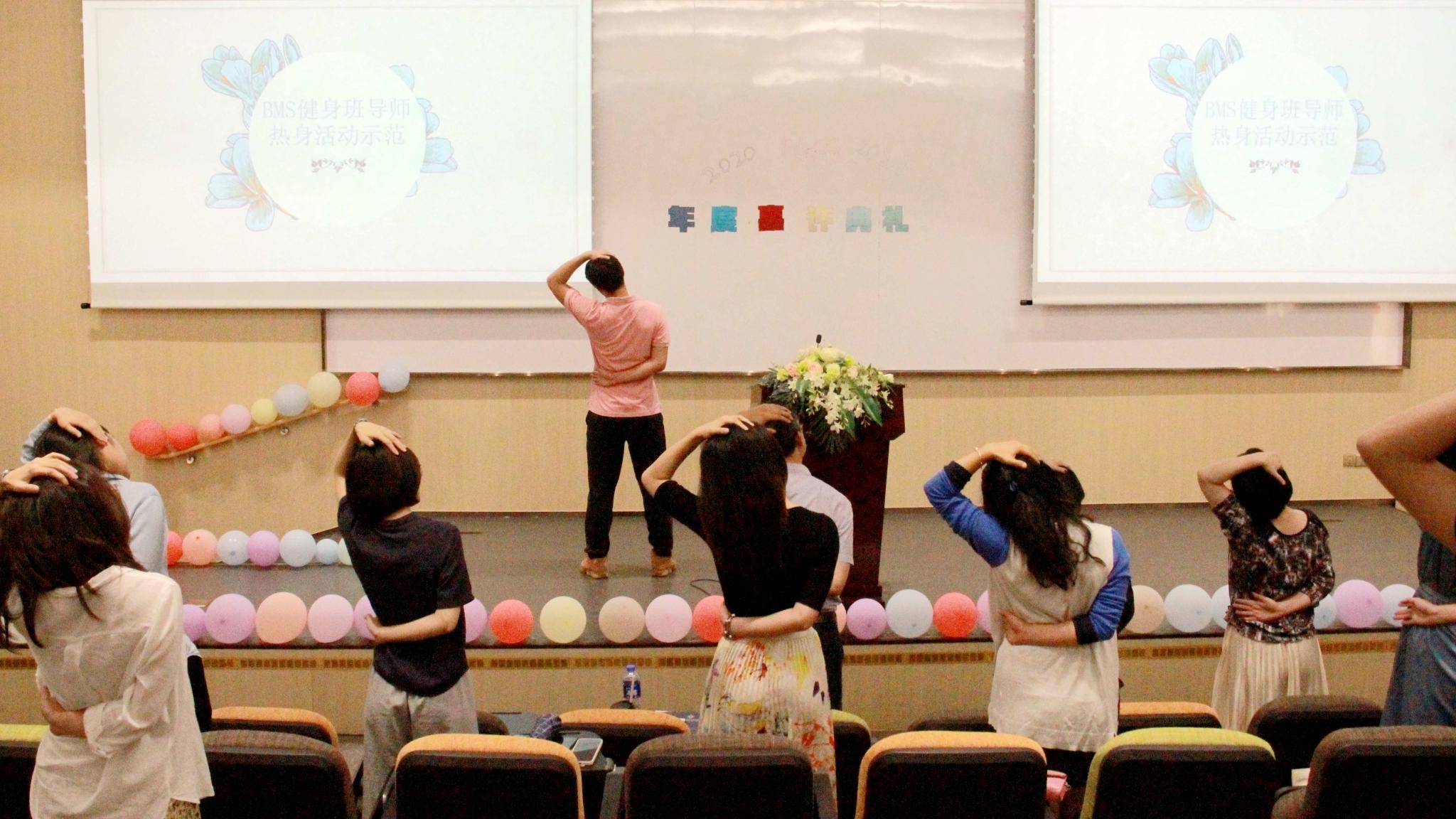 健身班导师现场带领师生做放松操