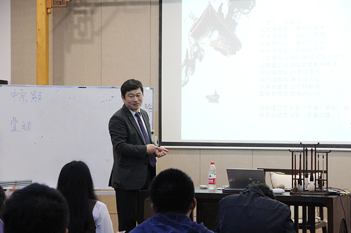 在讲座上,陈致教授指出“近体诗”区别于“古体诗”之处即是格律,并且是以唐音划分,由此切入主题——格律诗的起源、对仗及平仄等一系列知识。陈教授引经据典,用通俗易懂的语言将“故纸堆”里的格律知识进行深入浅出的介绍。在谈到古诗的掌故时,许多有趣的历史故事引得大家笑声连连,现场气氛轻松活跃。陈致教授还带来了厚厚的典故辞典和袖珍书供大家传阅,让同学们领略诗词的趣味。