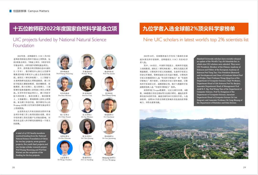 UIC在教研上不断发力,这学期成果丰硕。十五位教师获2022年度国家自然科学基金立项,多位教师获国家社科基金、教育部人文社科基金和广东省基础与应用基础研究基金项目立项。九位学者入选全球前2%顶尖科学家榜单。学子在全国大学生数学建模竞赛和中国日报“2022大学新闻奖”竞赛中斩获佳绩。
