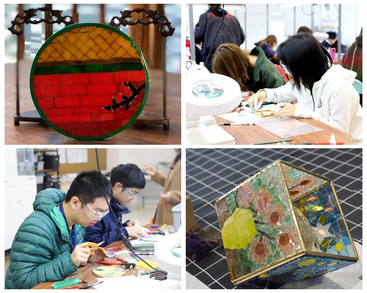 烧制、切割……玻璃艺术工作室丰富的制作工具帮助学生完成了玻璃制品从无到有的全过程。除了可以掌握珐琅工艺、马赛克镶嵌等技术外,学生在课堂上还培养了对色彩的认知和审美能力,创作出传统工艺与现代工艺结合的作品。值得一提的是,在玻璃艺术工作室也可以制作木艺乐器呢!