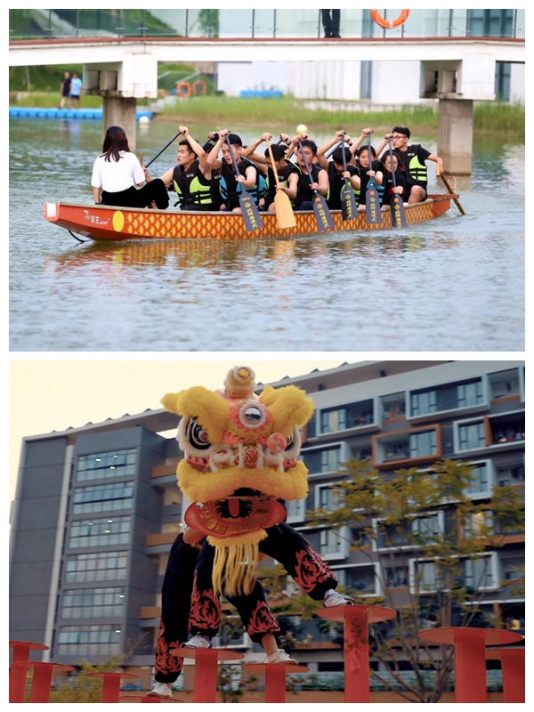 不仅如此,在校内,师生在中心湖上学习划龙舟,体验中华传统;在南狮高桩上了解龙狮文化,增强文化自信。