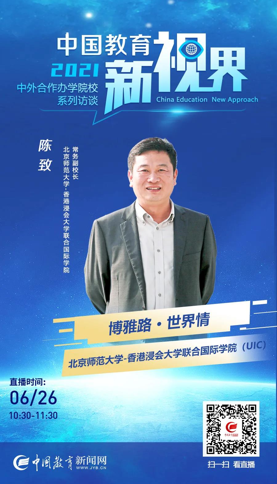 6月26日(明天)10:30,中国教育新闻网将专访北师港浸大(UIC)常务副校长陈致教授。为你深度解读UIC的博雅之路。