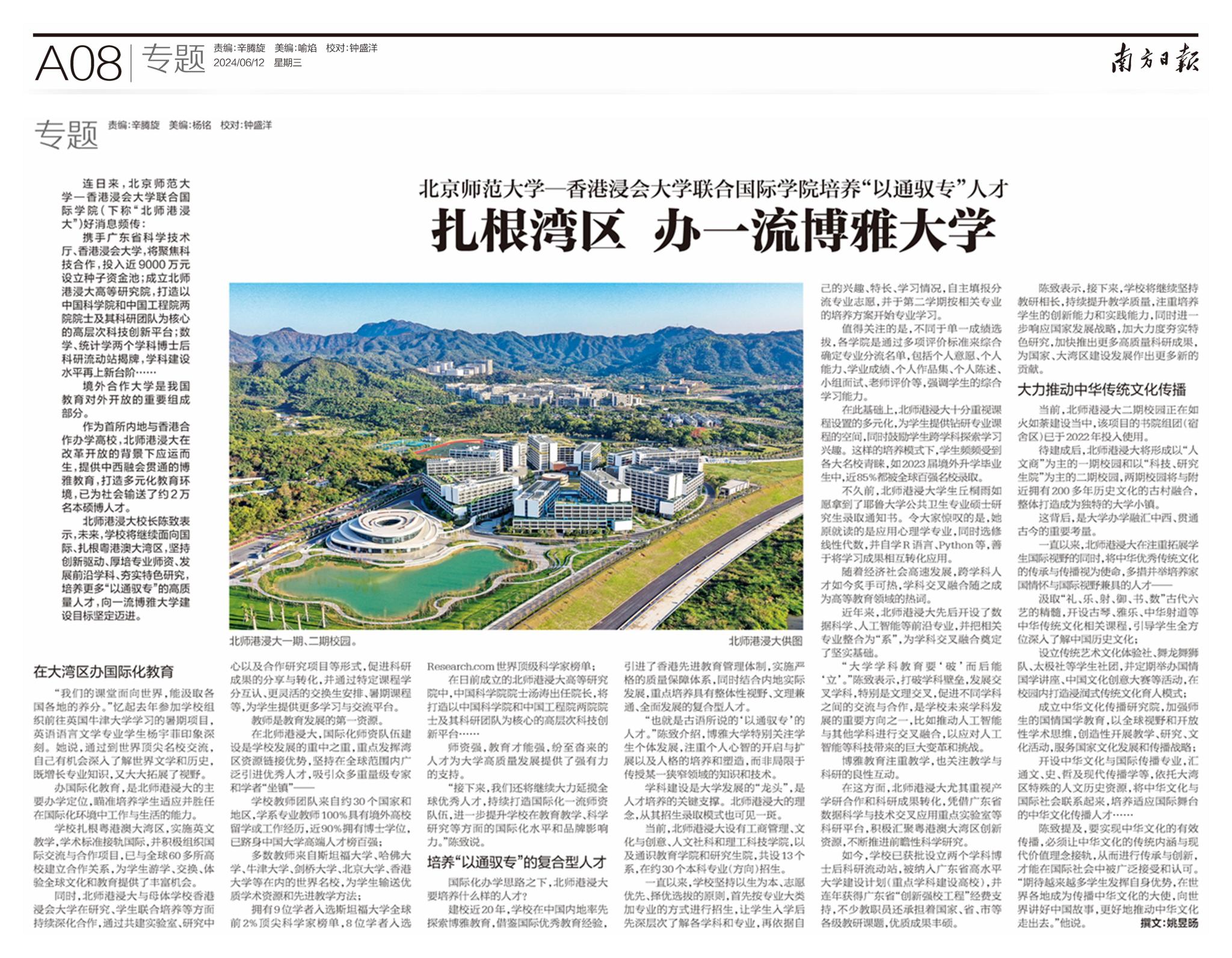 2024年6月12日,南方日报刊发专稿《北京师范大学—香港浸会大学联合国际学院培养“以通驭专”人才:扎根湾区 办一流博雅大学》。文章提到,北师港浸大(UIC)近期在科研合作、学科建设及国际化办学等方面取得了显著成果。作为内地与香港合作办学的典范,北师港浸大自创办以来,一直致力于培养具有国际视野和综合素质的高质量人才。学校通过实施博雅教育,引进国际化师资队伍,开展国际合作与交流项目,为学生提供了丰富的学习和发展机会。以下为报道全文: