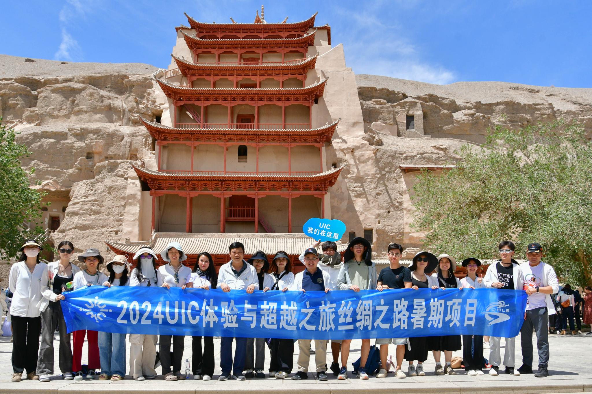 学生们与陈致校长(左八)、通识教育学院署理院长郭海鹏教授(右九)等老师在敦煌莫高窟