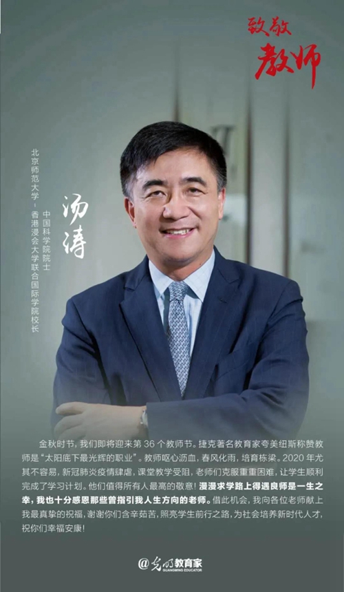 中国科学院院士、北师港浸大校长汤涛教授在《教育家》杂志上向所有教师送上祝福: