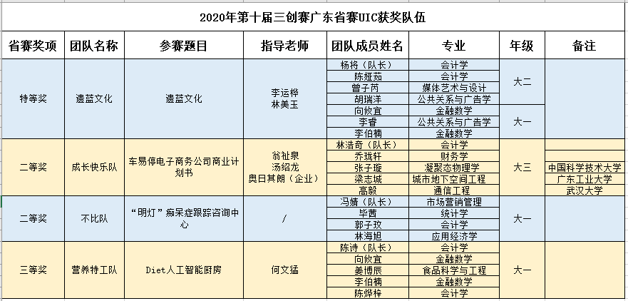 广东赛区2020年报名参赛学校共计51所,参赛团队合计1345支,参赛人数达到7200多人。经过各高校校赛层层筛选,272支团队入围广东省初级赛。UIC经由工商管理学部组织校内选拔,选出7支队伍参赛。其中,“遗蓝文化”项目团队获得省赛特等奖,指导老师李运桦博士和林美玉获评优秀指导教师奖。