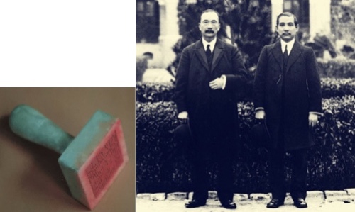 护法军政府颁发的总代表印章(左),以及孙中山和唐绍仪的合影