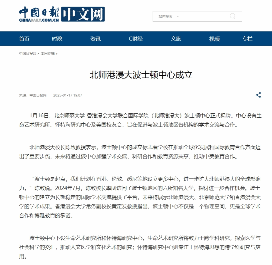 1月16日,北京师范大学-香港浸会大学联合国际学院(北师港浸大)波士顿中心正式揭牌。中心设有生命艺术研究所、怀特海研究中心及美国校友会,旨在促进与波士顿地区各机构的学术交流与合作。