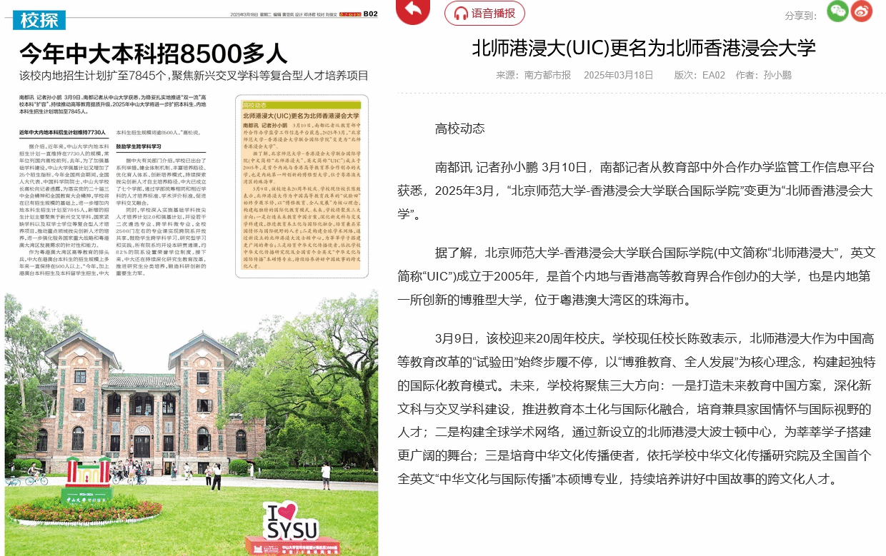 南都讯 记者孙小鹏 3月10日,南都记者从教育部中外合作办学监管工作信息平台获悉,2025年3月,“北京师范大学-香港浸会大学联合国际学院”变更为“北师香港浸会大学”。