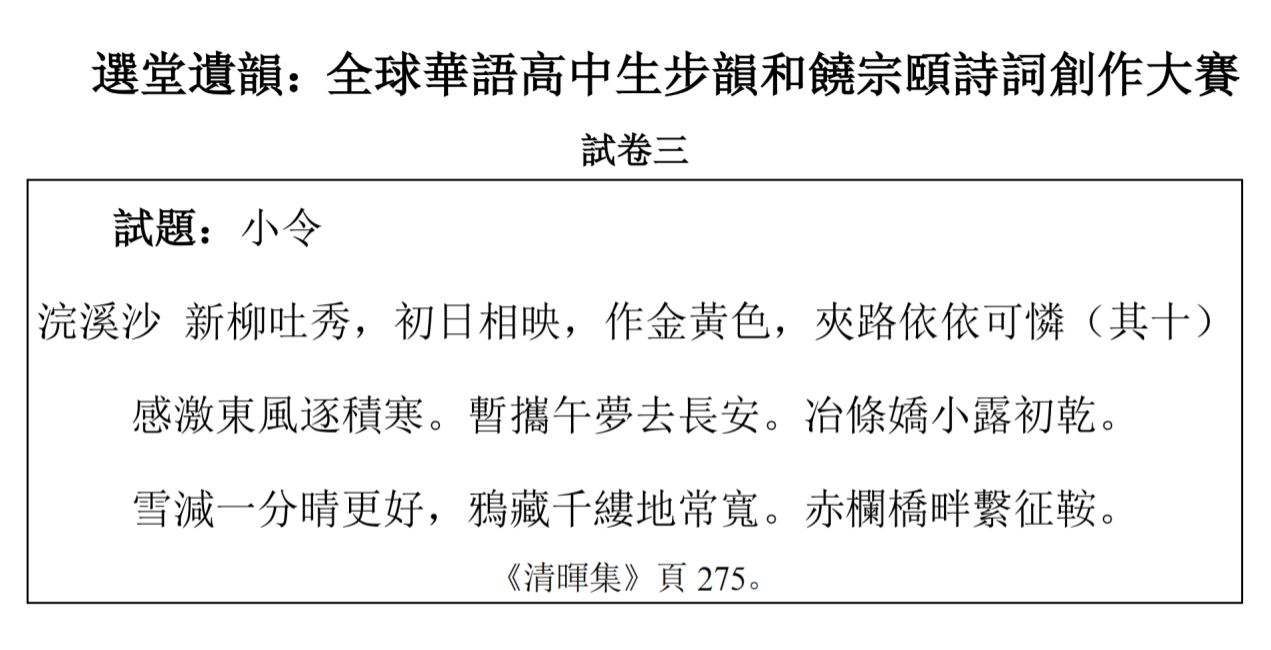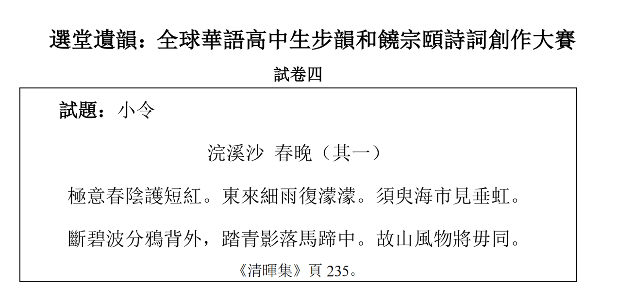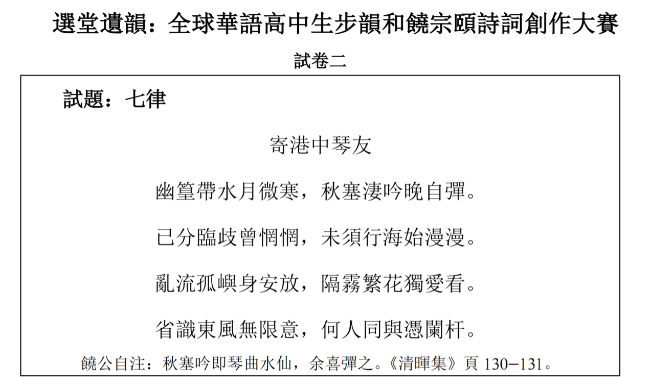 大赛面向全球华语高中生开放,学生以个人身份报名参赛。大赛采用线上比赛形式,由北师香港浸会大学组织,由评委委员会专家命题,一共4套,选手可以任选其中1套或2套,作步韵诗,在规定时间内线上提交。
