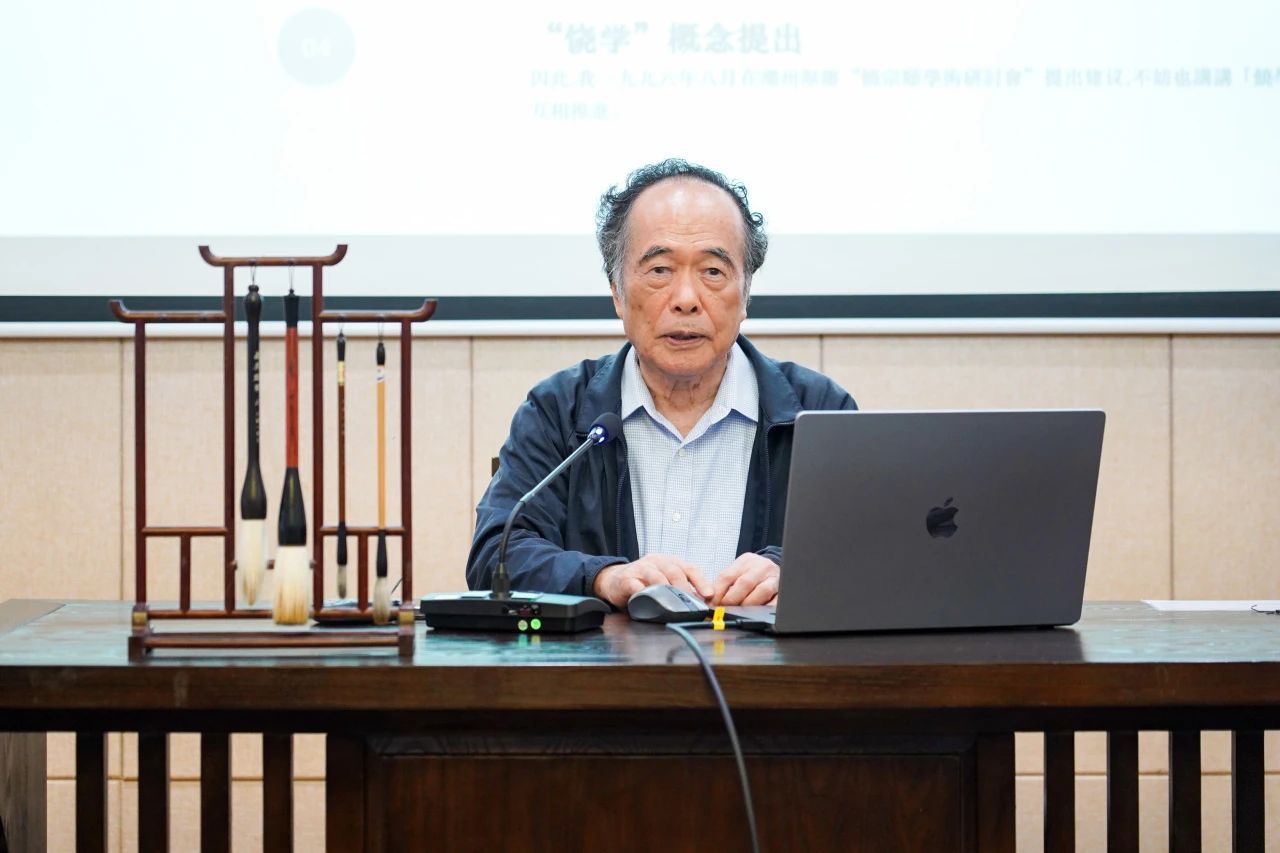 开幕式后,词学研究者、澳门大学荣休教授施议对带来题为“饶宗颐先生步韵和诗释例”的精彩讲座。本次讲座为“饶宗颐诗词”专题讲座第一讲,施议对在介绍中国诗歌传统和发展历程、步韵形式的基础上,以饶宗颐步韵和周邦彦《六丑·蔷薇谢后作》作《六丑·睡》为例,指出饶宗颐借词体原型将诗词中的情思提升至哲学高度。