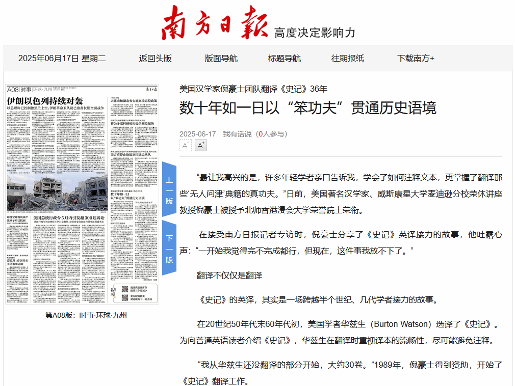 在接受南方日报记者专访时,倪豪士分享了《史记》英译接力的故事,他吐露心声:“一开始我觉得完不完成都行,但现在,这件事我放不下了。”