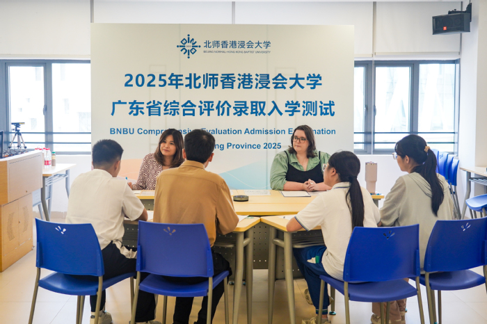 今年,是北师港浸大第13年举行广东省综合评价录取入学测试,采用线下全英文面试形式,分为“小组讨论”和“个人互动”两个部分,考生以三人或四人为一组,与考官进行互动,主要考查考生的语言流利度、沟通策略、逻辑思维、团队合作、组织能力等。