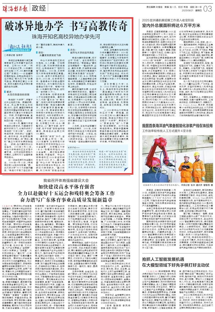 城市竞争,归根结底是人才与创新的竞争。高校作为人才的“蓄水池”与“孵化器”,如何为城市发展提供更强劲的支撑?珠海与高校携手,不断谱写改革新篇:2019年4月,教育部批复北京师范大学珠海分校转设为珠海校区,与校本部同水平、同标准办学,珠海自此拥有了第二所985高校。2024年,北京理工大学(珠海)调整定位,以“高于本部、快于本部、优于本部”的标准开启建设,珠海自此坐拥三所985高校。
