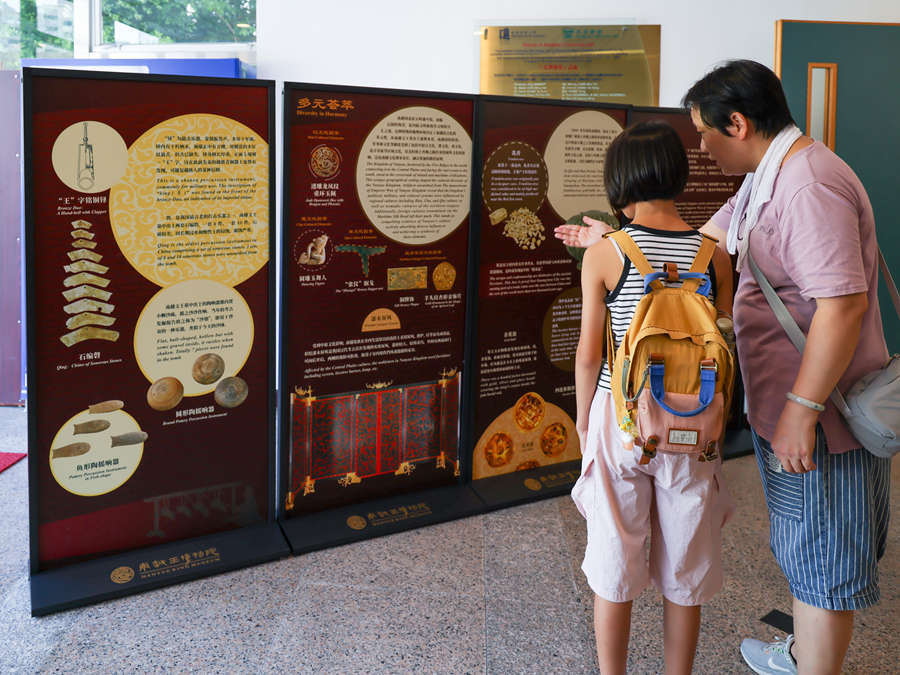 观众在北师香港浸会大学(BNBU)雅乐团全球巡演香港站场外展板区了解句鑃、楚式器物与南越文物等相关知识(摄影:何秋蓓)