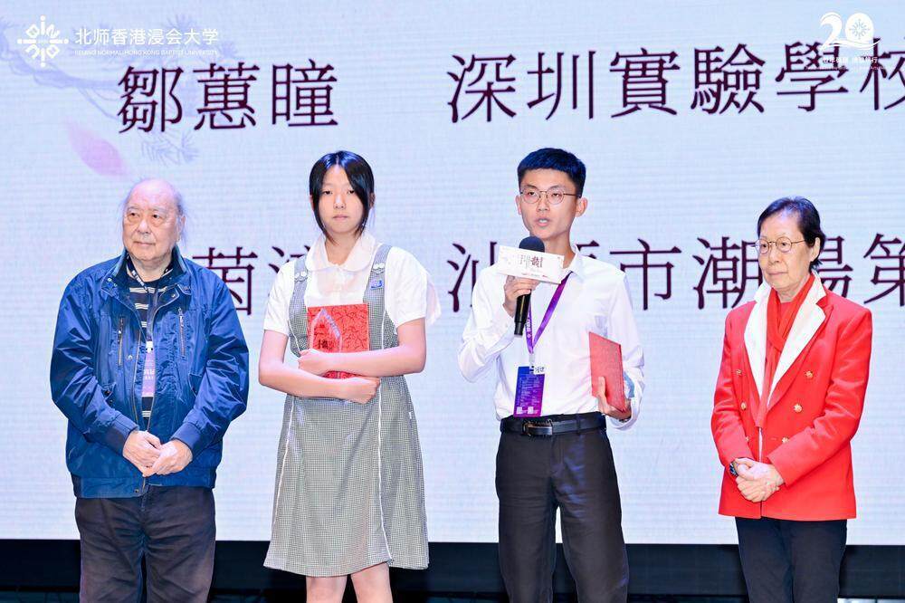 随后,现场嘉宾和评委为获奖选手颁奖。此次大赛共颁发一等奖2篇,分别是深圳实验学校高中园邹蕙瞳创作的《浣溪沙·珠海暮春》、汕头市潮阳第一中学李茵潼创作的《夜坐次选堂先生韵》。二等奖12篇、三等奖8篇、优秀奖12篇、积极创作奖10篇,以及诗意校园奖。获奖选手来自内地多个省市自治区,香港、澳门,以及越南等国家和地区。“这次北师港浸大把饶先生最精髓的诗词以比赛的形式呈现,让我十分感动。”在现场,饶宗颐先生之女、饶学联汇创会会长、饶学研究基金永远会长饶清芬勉励学子们,“希望青年学子继承和发扬中华优秀传统文化,延续中华文脉。”