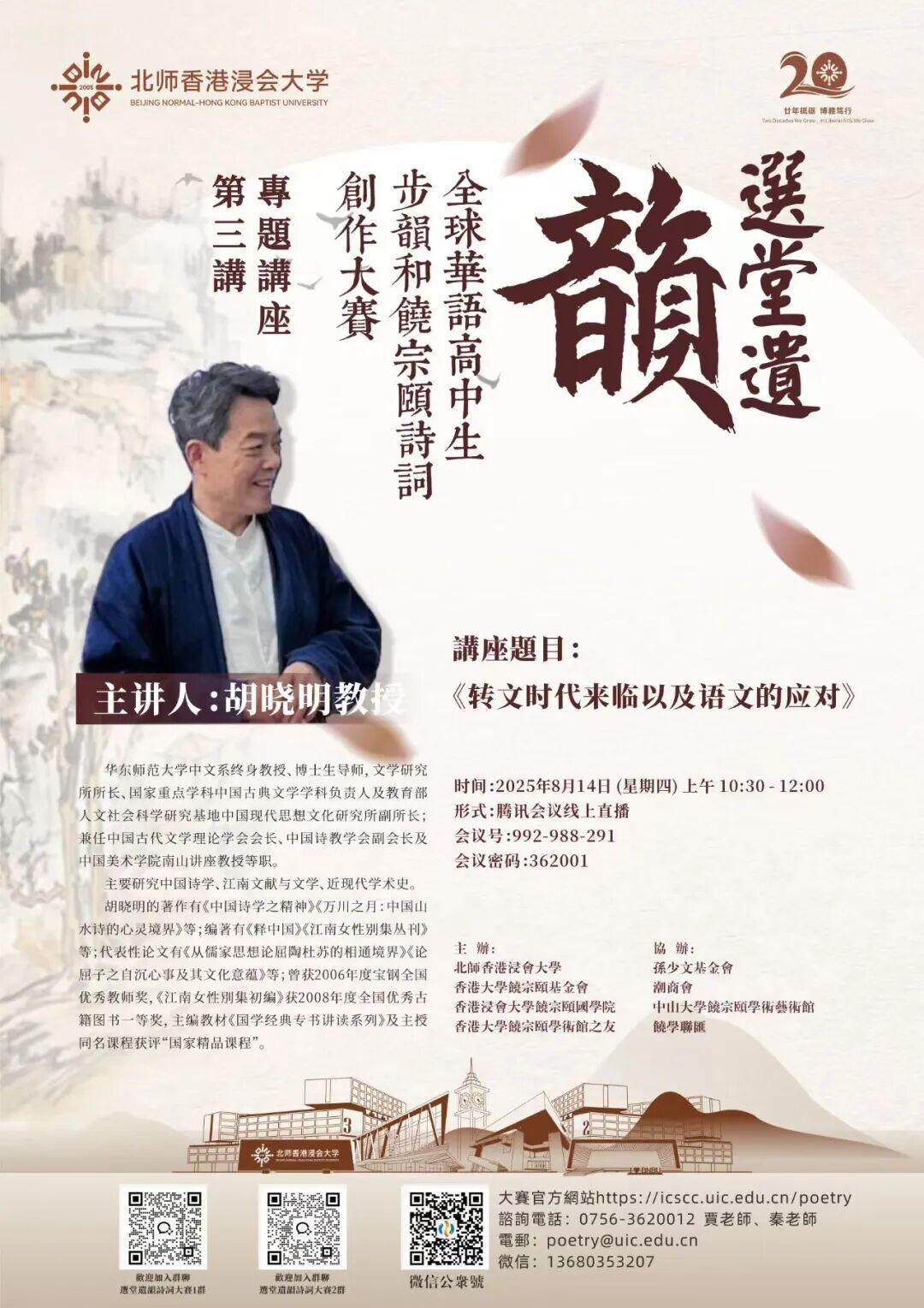 8月14日,应选堂遗韵:全球华语高中生步韵和饶宗颐诗词创作大赛组委会邀请,华东师范大学胡晓明教授为广大中学生、家长和语文教育工作者做了题为“转文时代,语文何为?”的专题讲座。1800多名听众线上参与,反响热烈。胡教授2019年在《文汇笔会》发表文章《中国文章学之「专」「转」「传」》,2025年上海市高考作文材料引用胡教授文章中「专」「转」「传」概念,引起热议,后经央视、新华社、澎湃新闻等数十家主流媒体广泛报导,进一步引发巨大社会争议。本次讲座胡晓明教授以“转文时代,语文何为?”为题,系统回应了数字技术对社会认知、文化传承与人文教育提出的严峻挑战与潜在机遇,对「专」「转」「传」作了清晰界定,为广大中学生、家长及语文教育工作者提供了一套兼具批判性与建设性的语文素养培育理论与实践路径。