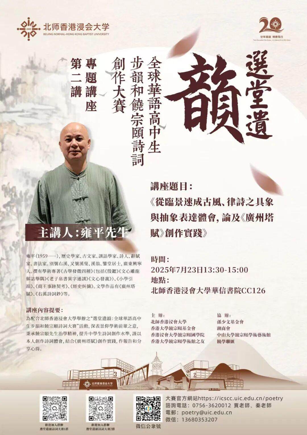 2025年5月至8月,大赛组委会邀请知名学者和诗人开设专题讲座,引导青少年理解和学习饶宗颐诗词,激发创作热情,提升语文素养学习兴趣。