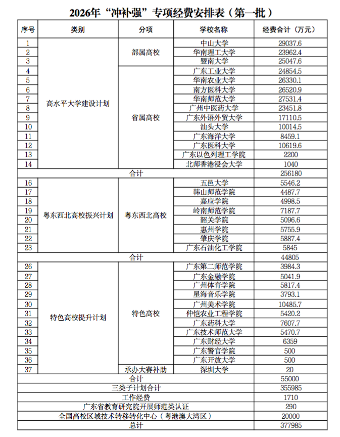 根据广东省教育厅公示的2026年“冲补强”专项经费安排表(第一批),经费一共分为“高水平大学建设计划”“粤东西北高校振兴计划”“特色高校提升计划”三类,三类子计划合计安排经费约35.6亿元。另有工作经费1710万元。