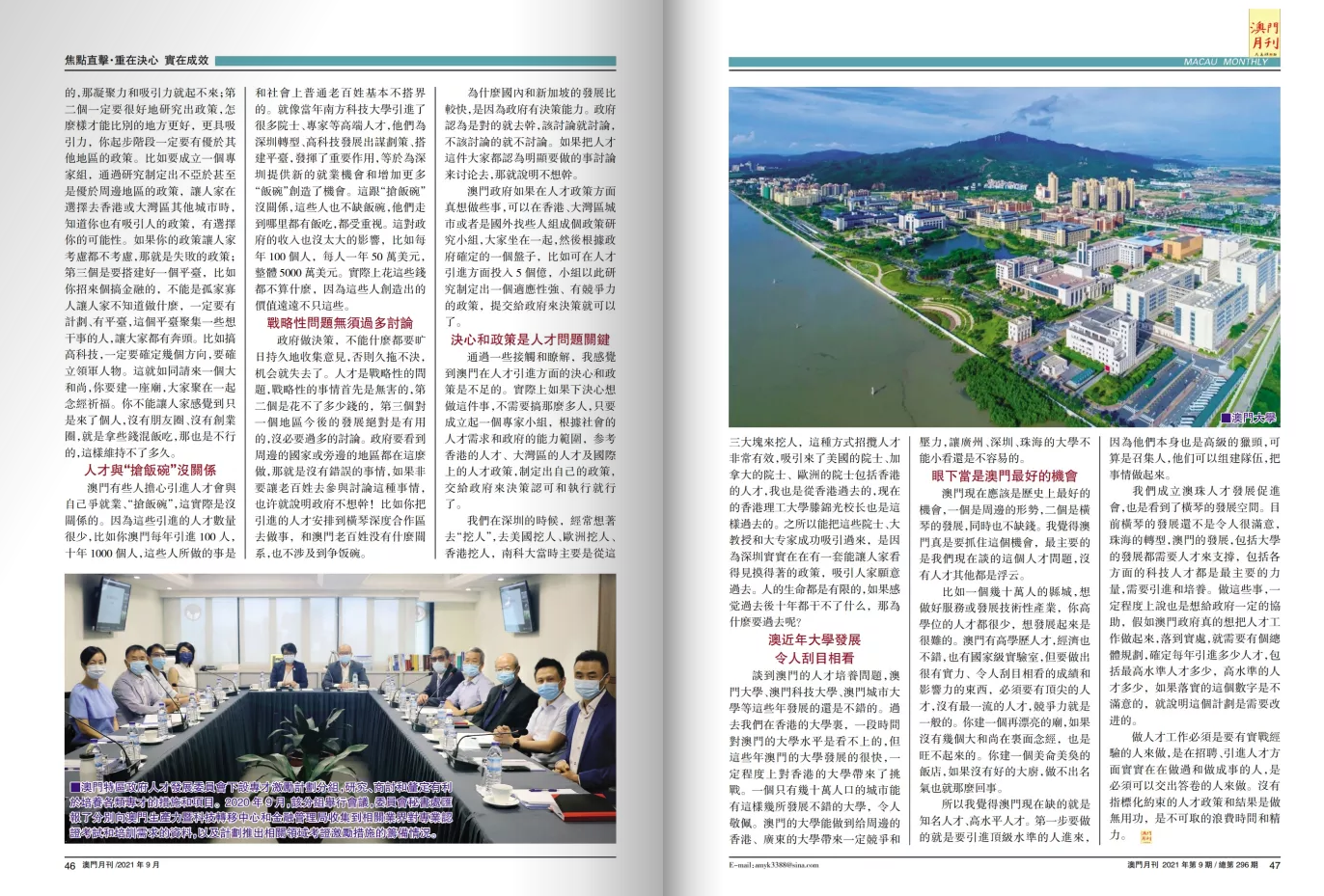 通过一些接触和了解,我感觉到澳门在人才引进方面的决心和政策是不足的。实际上如果下决心想做这件事,不需要搞那么多人,只要成立起一个专家小组,根据社会的人才需求和政府的能力范围,参考香港的人才、大湾区的人才及国际上的人才政策,制定出自己的政策,交给政府来决策认可和执行就行了。