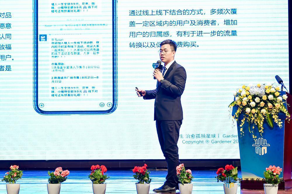 论坛开场,UIC公共关系与广告学专业毕业生陈卓首先分享了他的创业项目—“Gardener植人一生”。该项目的亮点是将植物养护搬上互联网,消费者可以在人工客服的指导下对植物进行养护,并且极大突出了植物的“陪伴”作用。现场,陈卓从发展机遇、采取的行动、取得的进展以及对未来的展望四个方面对“Gardener植人一生”项目进行了详细介绍。